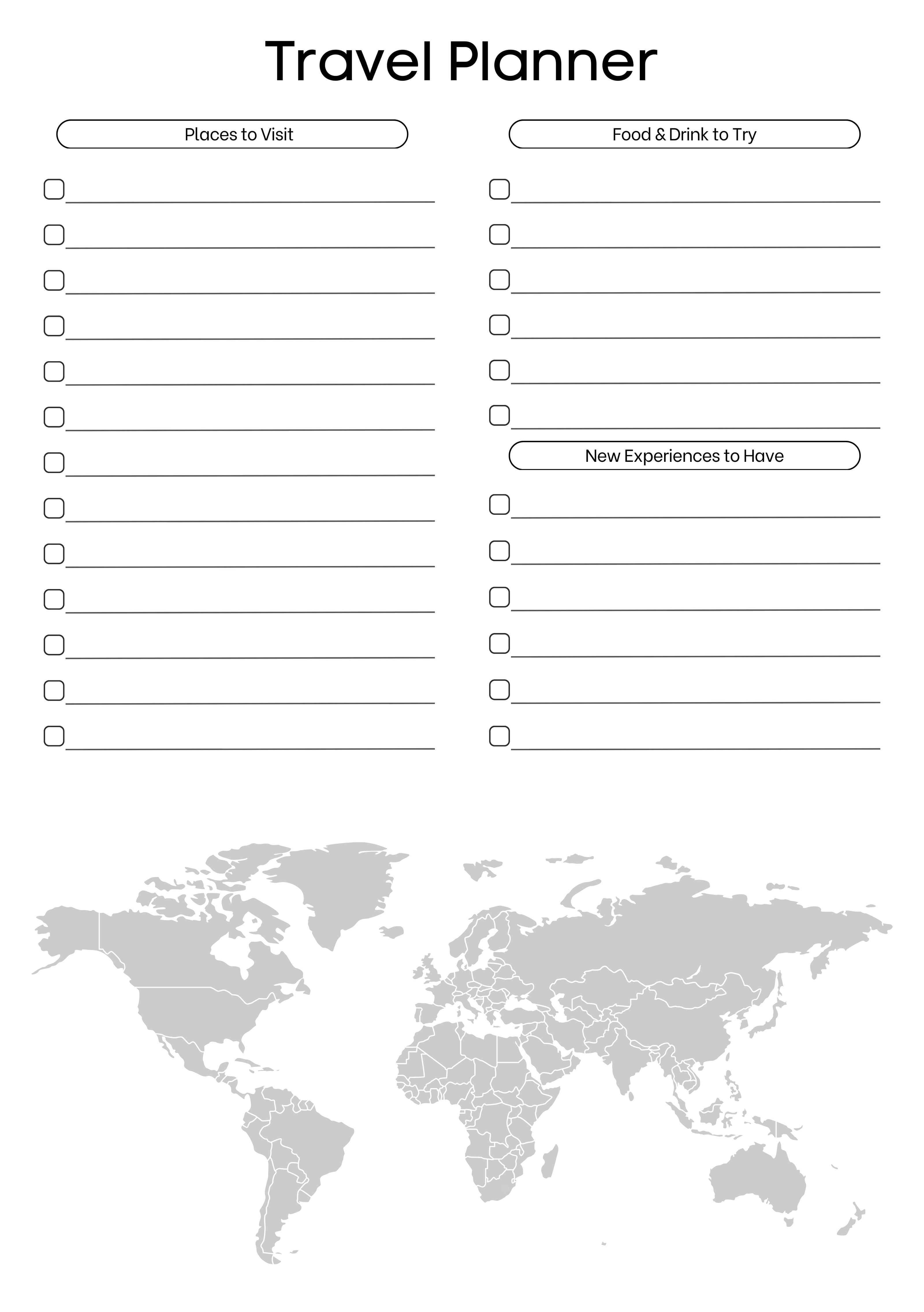 Travel PlannerEvery year provides a new chance to grow and explore. Sometimes by chance and sometimes very intentionally. ~ Chart your course for new adventure. ~ Seek out new food and drink ~ Search out new experiences ~ Record all of the travel you've done and reflect on a push pin travel year.