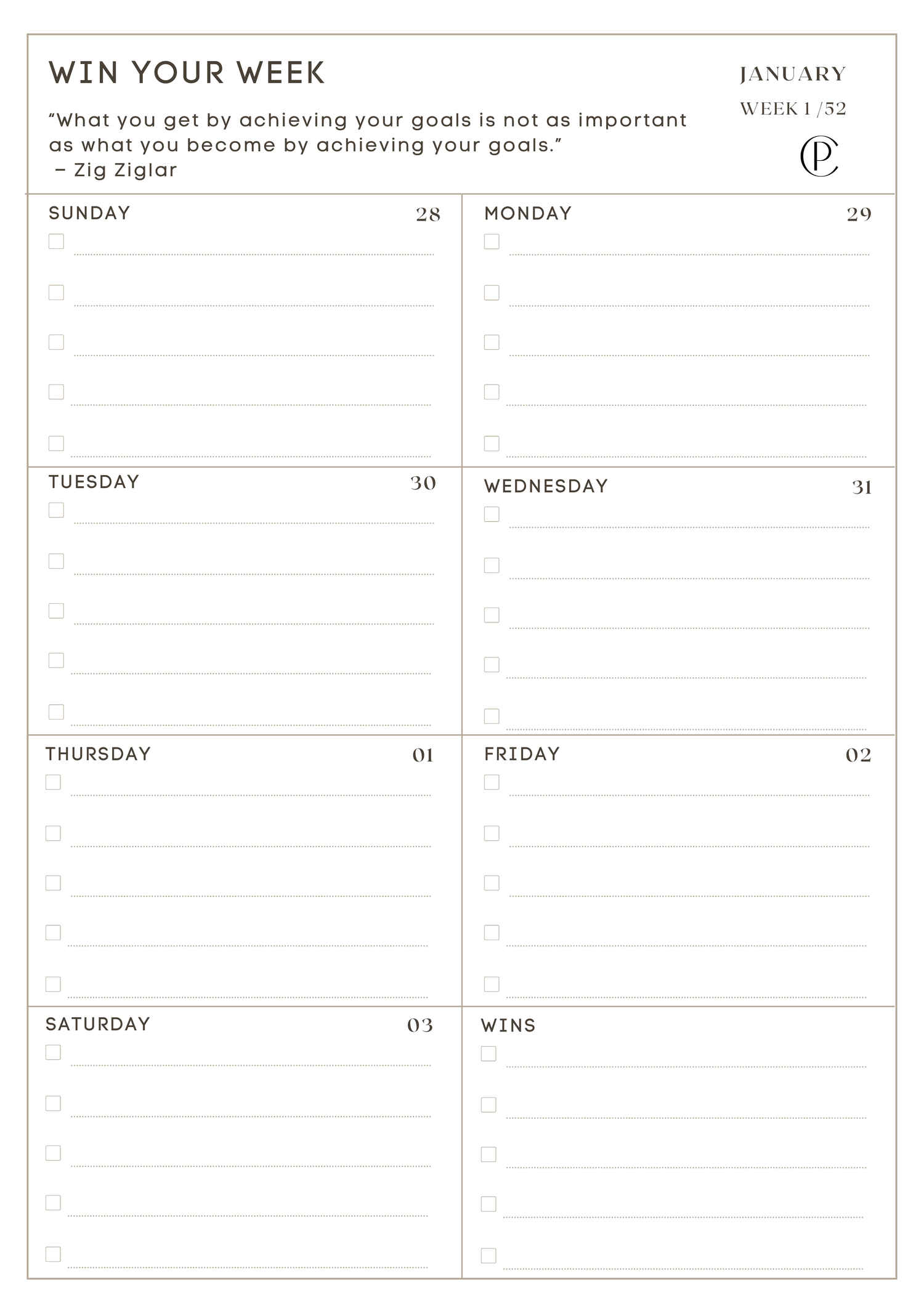 - Weekly To-Do List, Priorities Section & Dedicated section to recording your Wins!