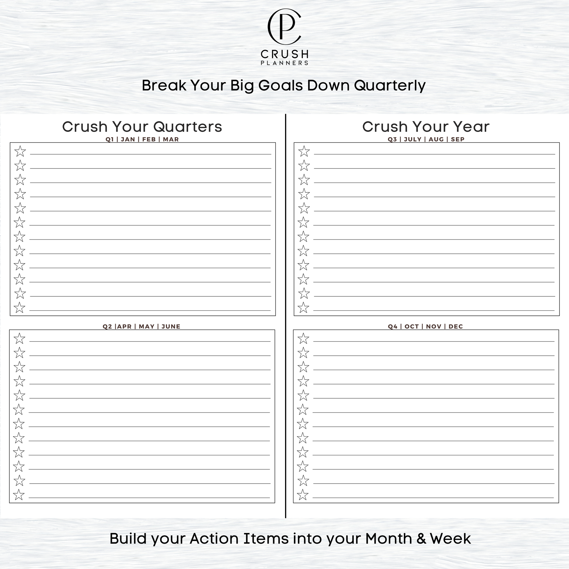 🖊️ Goal Tracking and Reflection: A Goal not written down is just a wish. Write it Down. Make it Real. Make it Happen. The Crush Planner includes dedicated sections for building out your annual goals in all aspects of your life. With a guide and sections for Professional Goals, Personal Goals, Health Goals, Financial Goals, Love Goals and Family Goals you will be able to set targets for all aspects for your life. The Quarterly Planner provides a great visual aspect to where your goals fall throughout the year and allows you to track your progress and reflect on your journey.