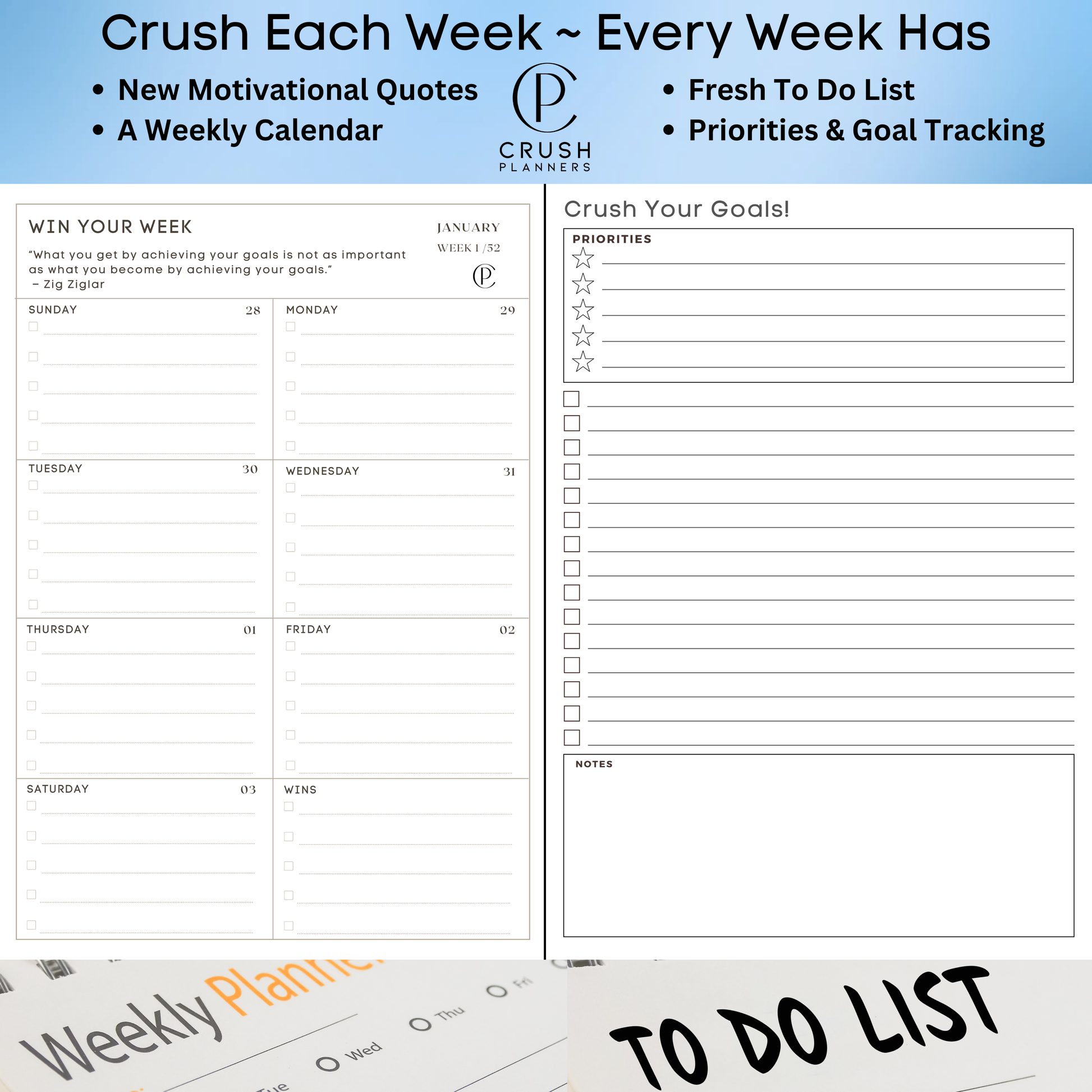 🌟 Motivation in Every Page: Life can be challenging and that is why your new Crush Planner starts each week with a new motivational quote, reminding you each day to stay focused on accomplishing your goals. Crafted for those who value planning, it transforms each week into a canvas for success. Celebrate achievements in the dedicated space for recording your weekly wins and make every week propel you towards your goals.